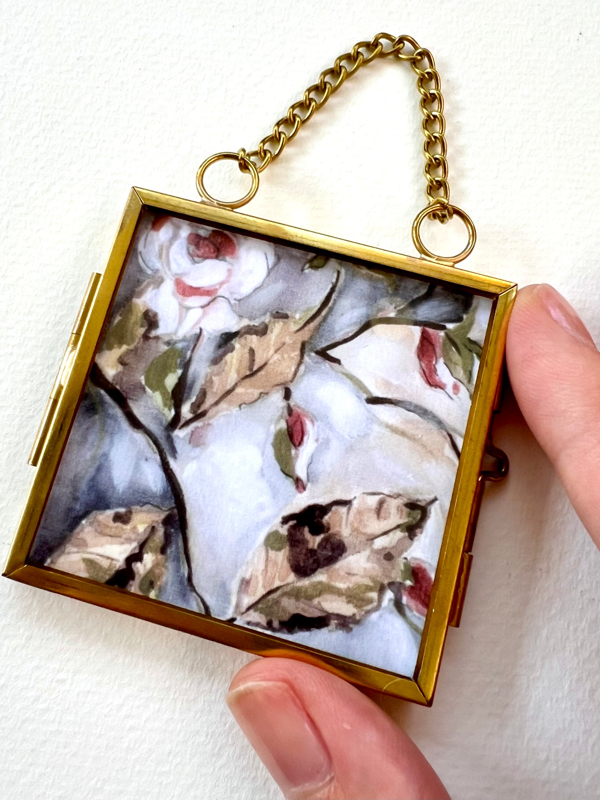 This charming mini framed art print ornament showcases a fine art print featuring abstract florals. Measuring 2x2 inches, the artwork is double sided and printed using premium archival fine art paper for long-lasting color and durability. The frame combines glass with gold-plated brass, making it a timeless keepsake you’ll treasure for years.