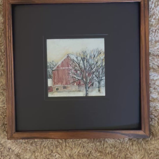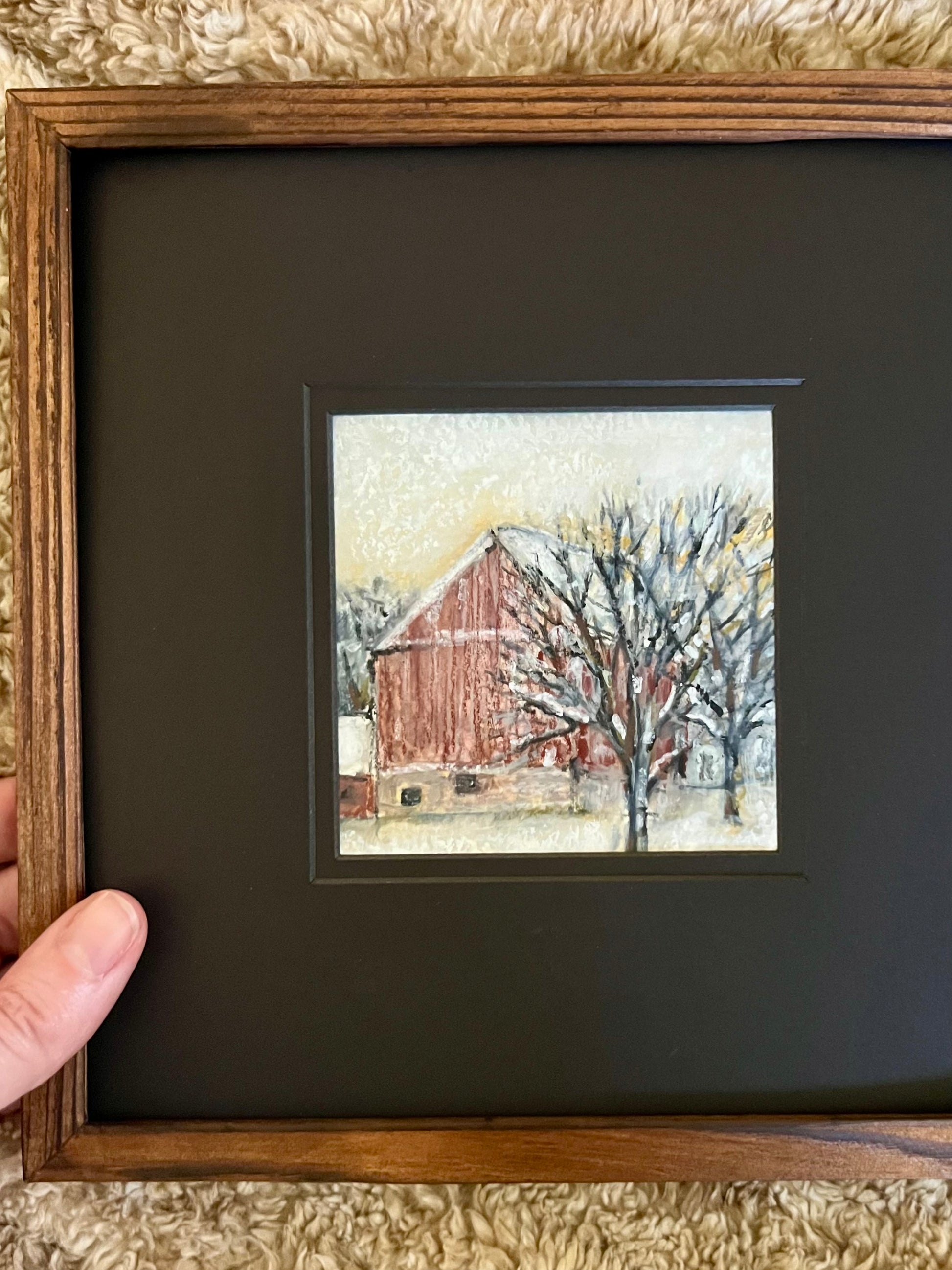 Capture the quiet magic of winter with “Snowy Red Barn”, an intimate original landscape. This tiny study holds a big story—fresh snowfall dusting the ground, a classic red barn glowing against a soft winter sky, and bare trees standing peacefully in the cold light.