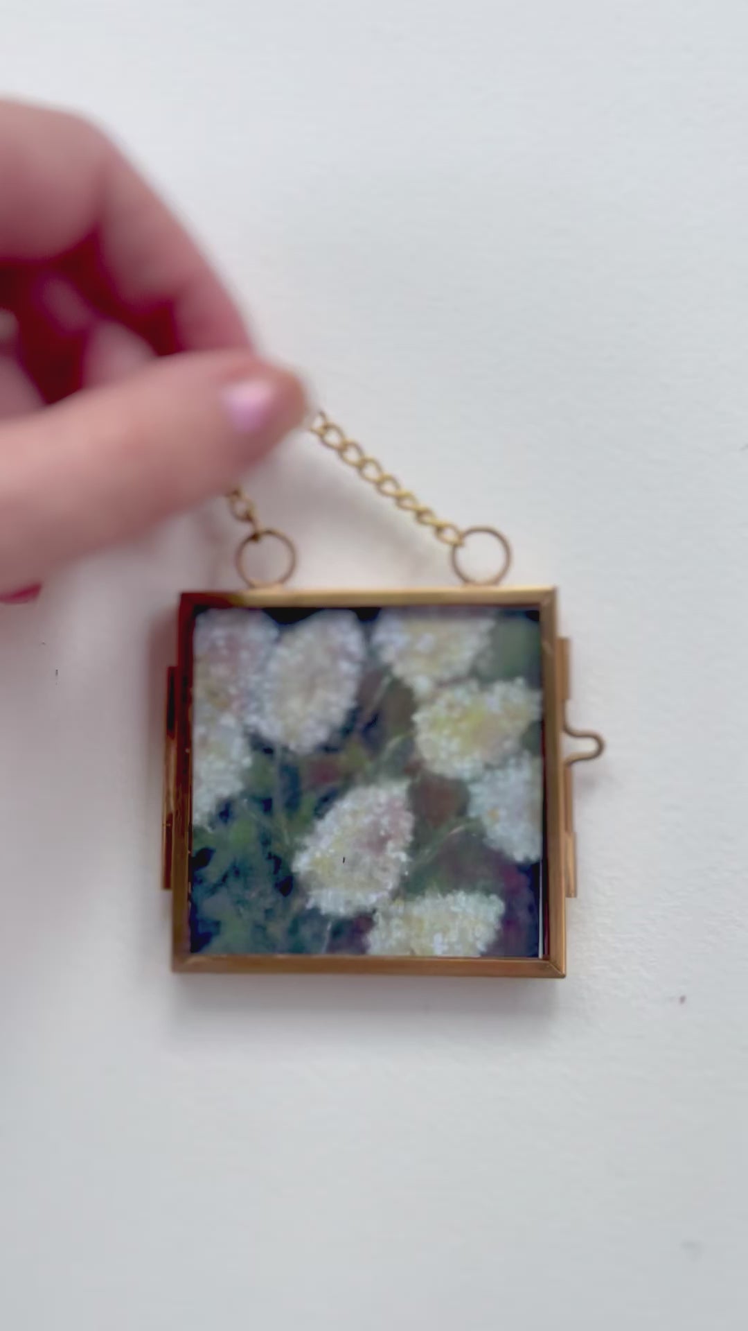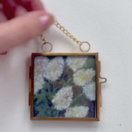 This charming mini framed art print ornament showcasing “Vintage Blooms” fine art print. Measuring 2x2 inches, the artwork is double sided and printed using premium archival fine art paper for long-lasting color and durability. The frame combines glass with gold-plated brass, making it a timeless keepsake you’ll treasure for years.